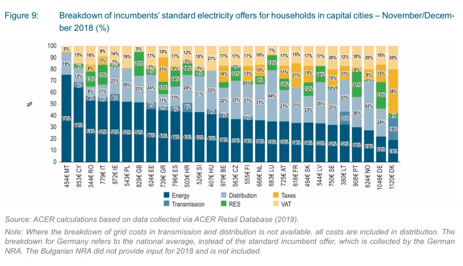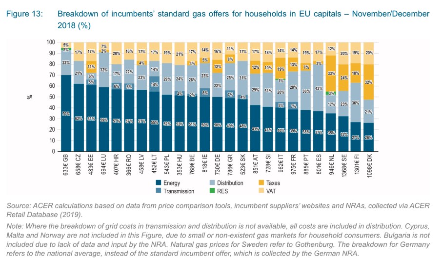 Također, Izvješćem se analizira struktura faktora koji utječu na cijenu električne energije i plina u državama članicama. Kao glavni faktori navode se cijena energije, cijena prijenosa energije, naknade za potporu obnovljivih izvora energije, ostali porezi i naknade, i porez na dodanu vrijednost. Sljedeći grafovi pokazuju strukturu tih faktora cijene električne energije i plina u glavnim gradovima država članica i Norveške.