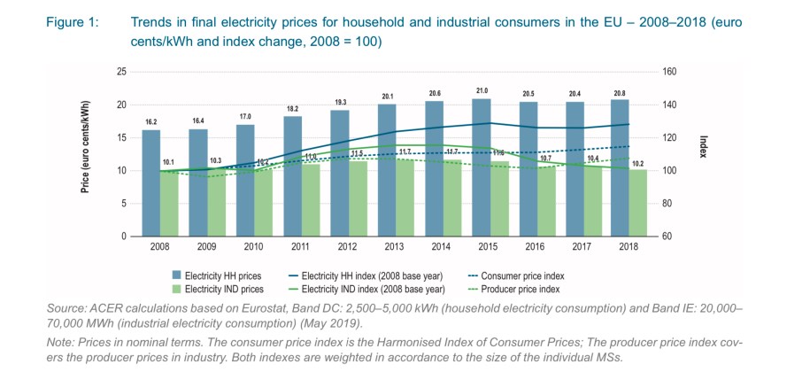 Što se tiče cijena električne energije, u zadnjih 10 godina došlo je do značajnih izmjena. Tako je na razini EU cijena električne energije za kućanstva skočila prosječno čak 28,4%, što je značajno više od stope inflacije u navedenom razdoblju. Cijena električne energije za gospodarske korisnike u istom razdoblju skočila je samo 1,4%. Ovoliko povećanje cijene za kućanstva nije posljedica povećanja cijene same električne energije, već davanja poput troškova prijenosa, poreza i taksi za poticanje korištenja obnovljivih izvora energije