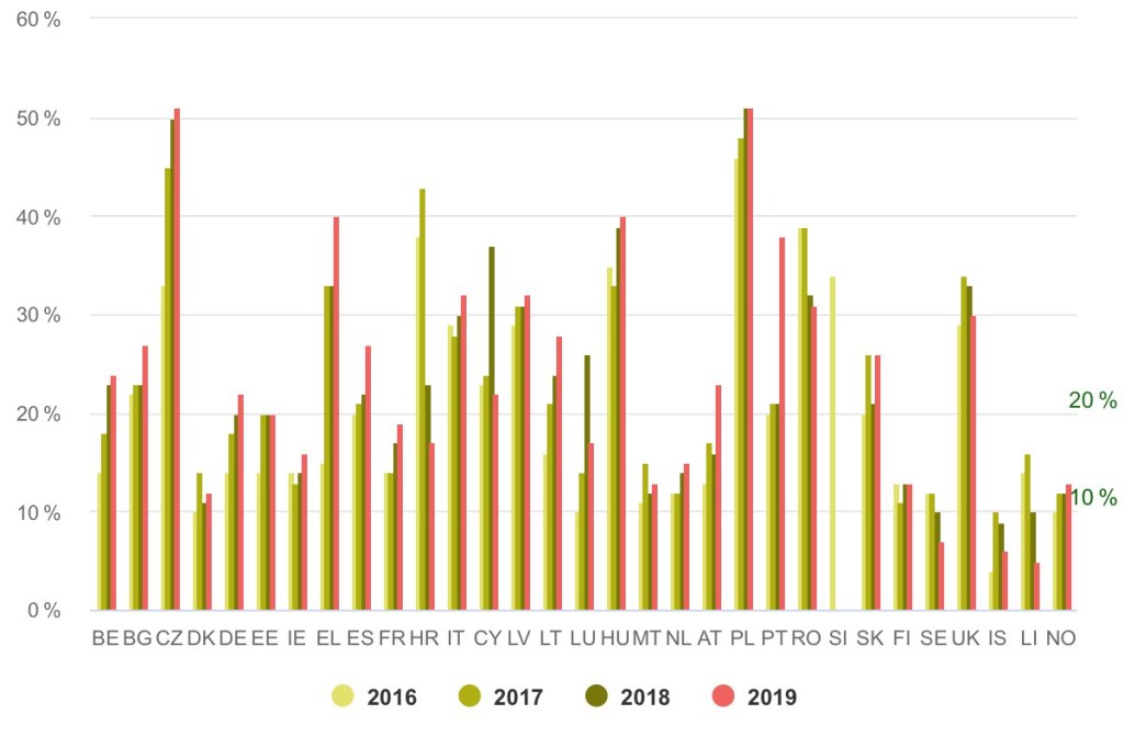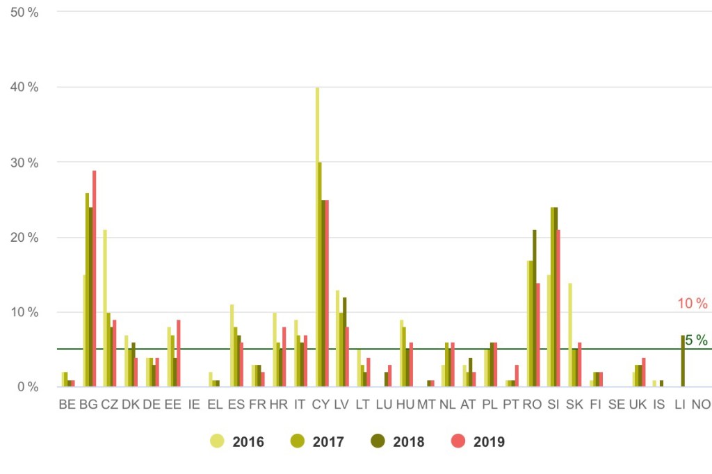Iako nesavršen [efn_note] Neke prijedloge za poboljšanje Single Market Scoreboarda vidi u ovoj studiji. [/efn_note], još uvijek je koristan alat za utvrđivanje općih trendova tržišnog natjecanja država članica ali i specifičnih tržišta poput javnonabavnog. Dobra vijest je da prema podacima novog posebnog javnonabavnog Scoreboarda [efn_note] Koji se temelji na podacima za 2019. [/efn_note] ima više država članica koje su u ”zelenom”, gdje je i dalje i Hrvatska. [efn_note] Ujedinjeno Kraljevstvo je i dalje prisutno u istraživanju budući da je riječ o podacima za 2019. [/efn_note]