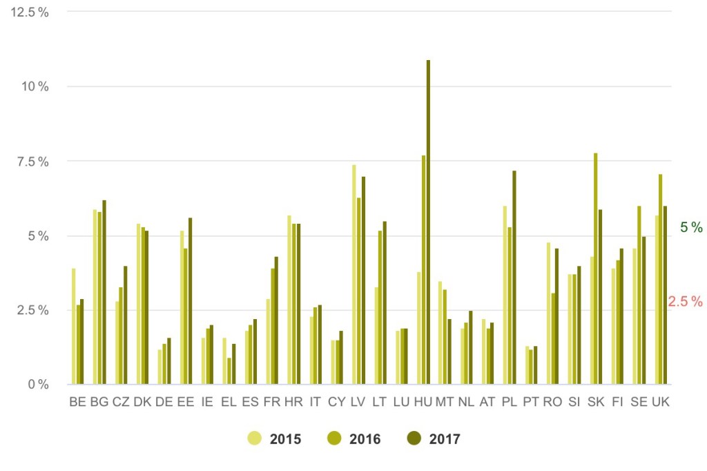 dok kod vrijednost javnonabavnih postupaka oglašenih u TED-u ne primjećujemo nikakve promjene [efn_note] Zbog kašnjenja u dostupnosti podataka, podaci za ovaj kriterij su iz 2017., pa uspoređujući podatke za 2016. i 2017. vidimo da je postotak isti – 5,4% [/efn_note];