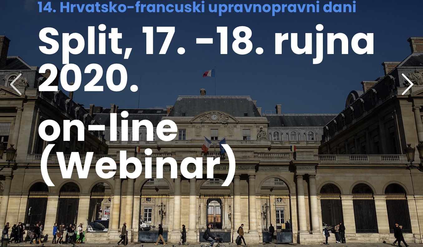 U Splitu će se od 17. do 18. rujna 2020. održati tradicionalni 14. Hrvatsko-francuski upravnopravni dani. Skup je pod pokroviteljstvom Ministarstva pravosuđa i uprave, a organizatori su Pravni Fakultet u Splitu, Sveučilište Panthéon Assas, Pariz II, Sveučilište u Splitu, Državni savjet Republike Francuske, Visoki upravni sud Republike Hrvatske i Centar za europsku dokumentaciju i istraživanja – ”Robert Schuman”.