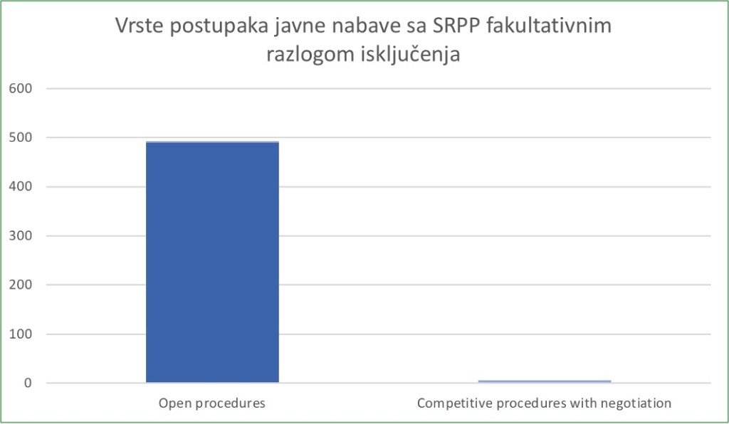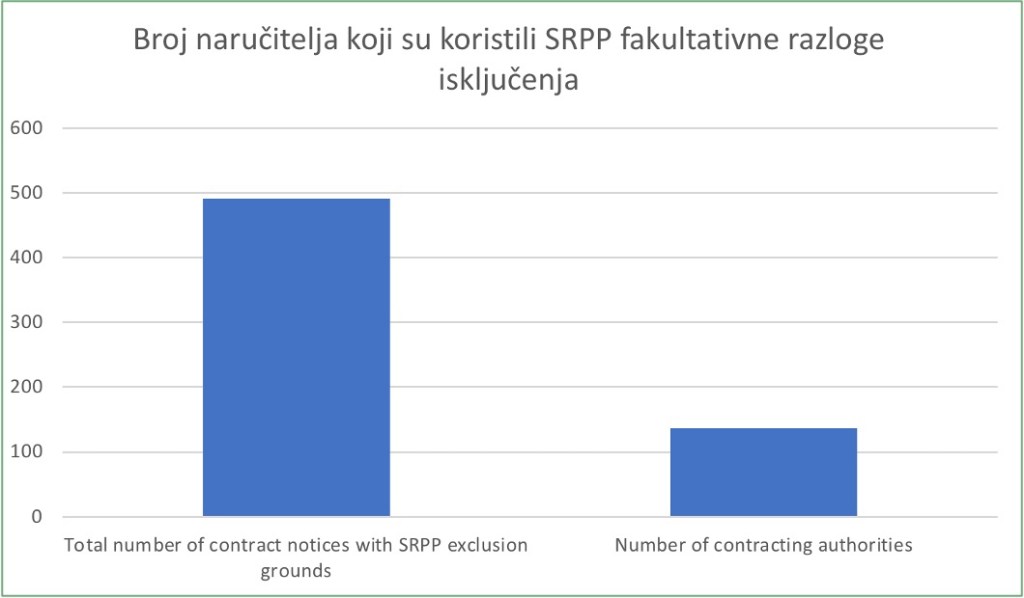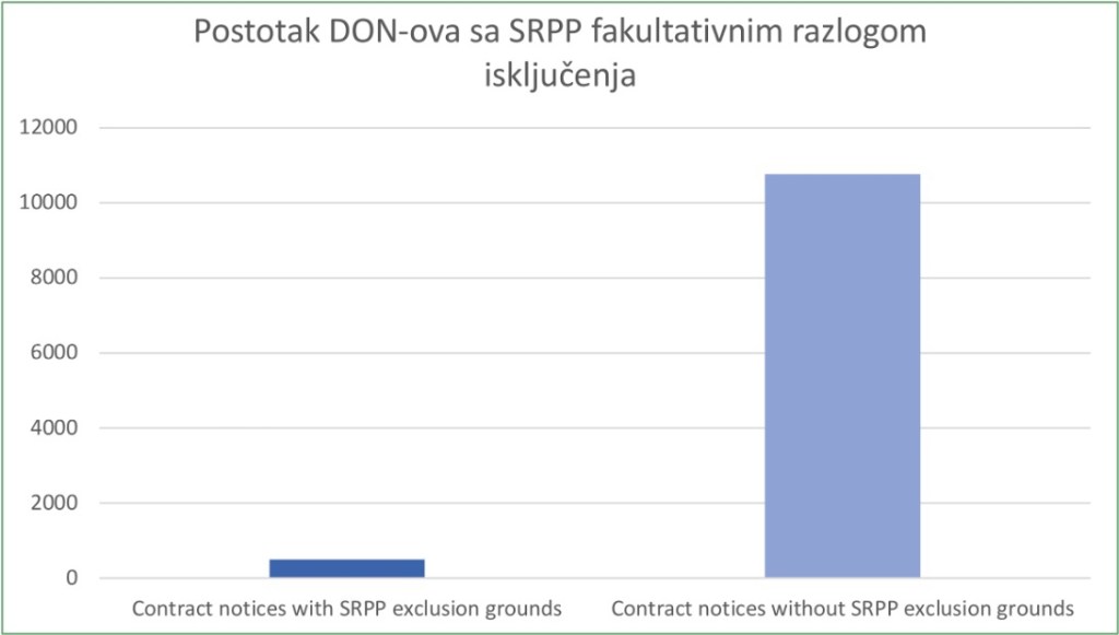 Samo 491 od 11.225 (4,37%) dostupnih DON-ova iz 2022. uključuje socijalne fakultativne razloge za isključenje. Naručitelji nisu prepoznali vrijednost korištenja ovakvog razloga isključenja. Ovo također pokazuje da je pristup EU-a kod fakultativnih razloga isključenja općenito (ali i posebno kod socijalne nabave) doista ugrozio načelo ujednačenog europskog tržišta (2011. Zelena knjiga), uzrokovao regulatornu fragmentaciju (Priess) i učinio prekograničnu trgovinu još težom (van Garsse, de Mars).