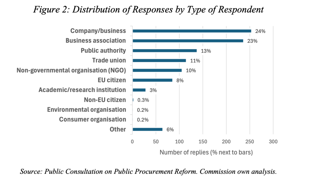 On 27 March 2026, the Commission published the Factual Summary Report on the Public Consultation on the Revision of the Public Procurement Directives. Of the 1,037 responses received, the overwhelming majority came from business-related stakeholders — companies and business associations together make up 47% of respondents, with public authorities at 13%, trade unions at 11% and NGOs at 10%. Academics contributed a mere 3%. This is not a representative sample of EU stakeholder opinion on public procurement reform, and should not be treated as one. But it does reveal the direction in which the political wind is blowing — and for anyone interested in the external dimension of EU public procurement law, that direction is unmistakable.