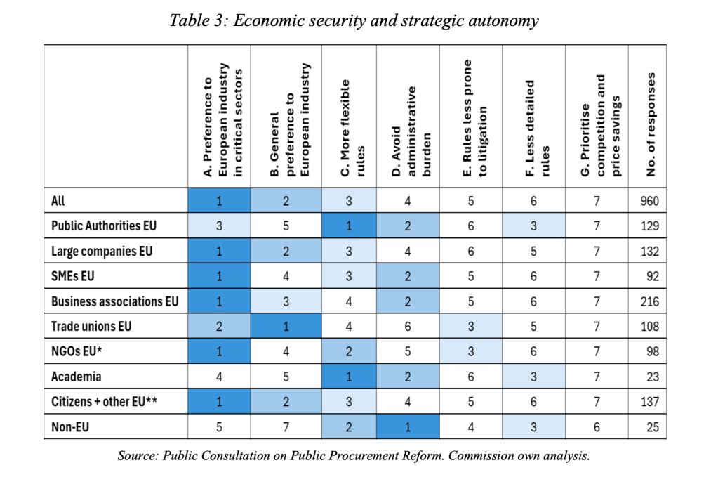A tension runs through the consultation data that deserves attention. In the priority-ranking exercise (Table 3), respondents were asked to rank objectives related to economic security and strategic autonomy. Most groups ranked “preference to European industry in critical sectors” first, with “general preference to European industry” second. This suggests a preference for sector-specific rather than horizontal protectionism.